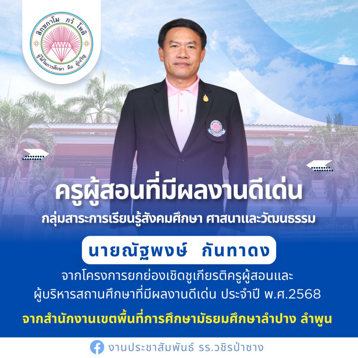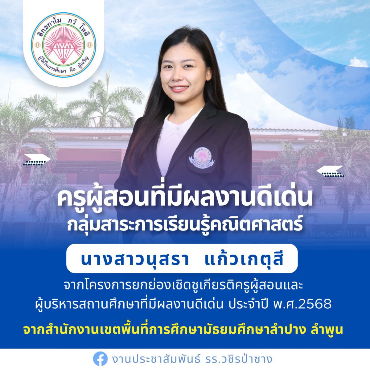 โรงเรียนวชิรป่าซาง ขอแสดงความยินดี คณะครูทุกท่าน ในโครงการยกย่องเชิดชูเกียรติครูผู้สอนและผู้บริหารสถานศึกษาที่มีผลงานดีเด่น ประจำปีการศึกษา 2568 จากสำนักงานเขตพื้นที่การศึกษามัธยมศึกษาลำปาง ลำพูน