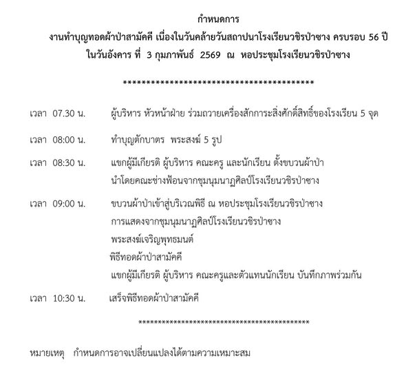 เนื่องในโอกาสวันสถาปนาโรงเรียนวชิรป่าซาง และครบรอบการก่อตั้งโรงเรียน 56 ปี