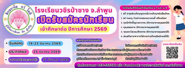 สมัครที่โรงเรียนวชิรป่าซาง ตั้งแต่วันที่ 19-23 มีนาคม 2569 เวลา 08.30-16.30 น. ณ อาคารโสภณวชิรธรรม โดยไม่เว้นวันหยุดเสาร์อาทิตย์