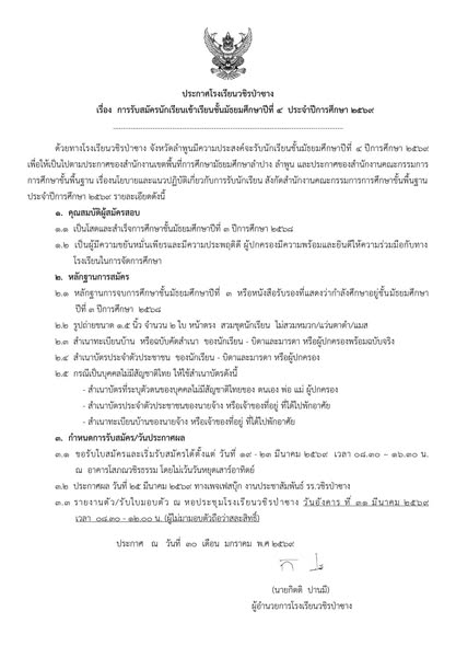 เรื่อง การรับนักเรียนชั้นมัธยมศึกษาปีที่ 1 ชั้นมัธยมศึกษาปีที่ 4 ประจำปีการศึกษา 2569