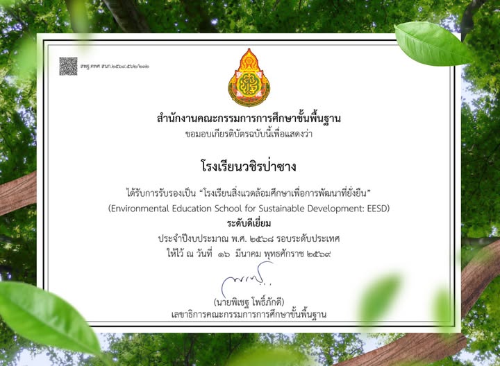...สำนักงานคณะกรรมการการศึกษาขั้นพื้นฐาน (สพฐ.) ได้มอบเกียรติบัตรรับรองให้โรงเรียนวชิรป่าซางเป็น "โรงเรียนสิ่งแวดล้อมศึกษาเพื่อการพัฒนาที่ยั่งยืน" (Environmental Education School for Sustainable Development: EESD)